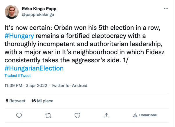 A distanza di una settimana dal voto, abbiamo quindi deciso di preparare una speciale puntata podcast che ha coinvolto l’intera redazione. Un modo per cercare di comprendere com’è andata, come si è arrivati, e dove andrà ora l’Ungheria. A integrazione del podcast potete trovare i testi di aperture e di chiusura, link ai servizi giornalistici citati nella nostra rassegna stampa e una speciale sezione Twitter con le reazioni dei protagonisti.