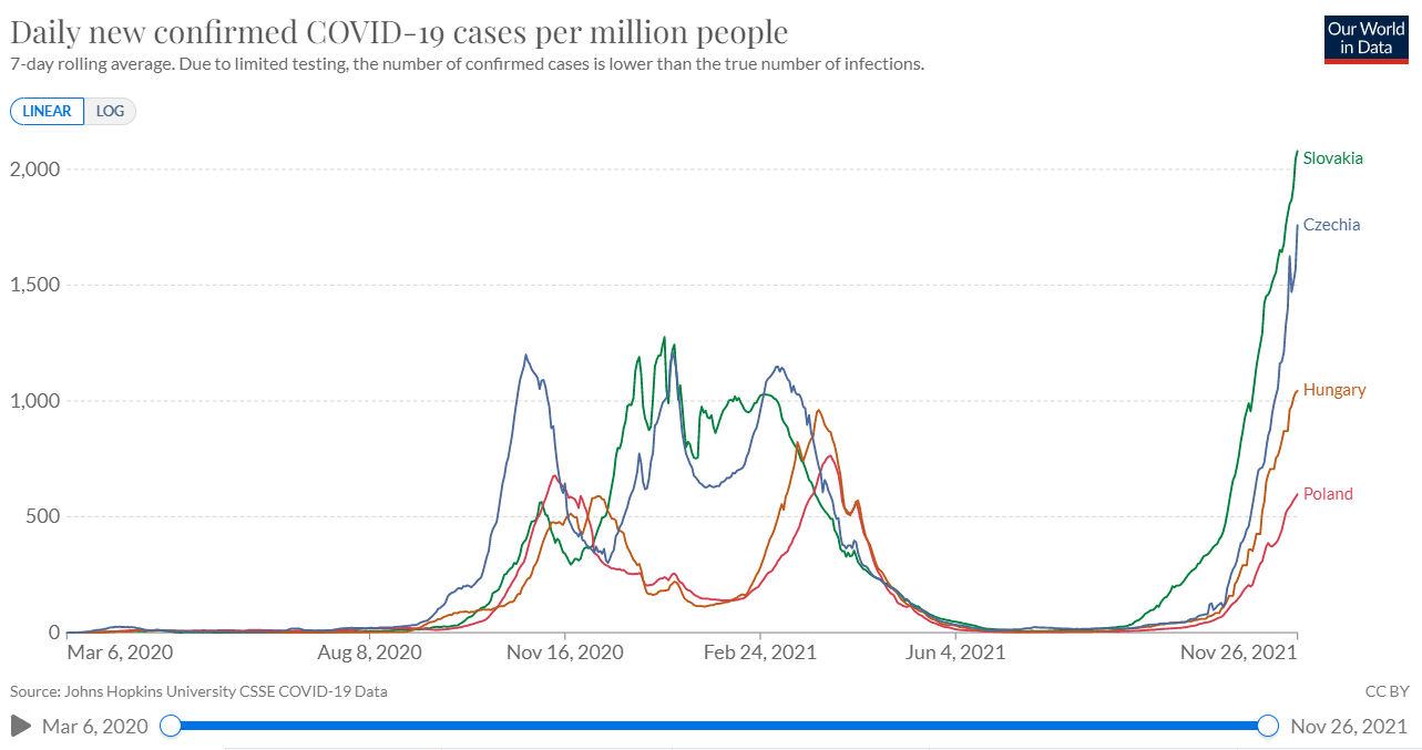 Intanto, in attesa dell’impatto della temuta variante Omicron del virus SARS-CoV-2, prosegue e si intensifica la quarta ondata del covid-19 in Polonia, Repubblica Ceca, Slovacchia e Ungheria. I quattro Paesi restano fra quelli nell’Ue con la minor percentuale di vaccinati e questo comporta una maggiore diffusione del virus. Al 26 novembre il quadro è preoccupante con 2079 nuovi contagi giornalieri per milione di abitanti in Slovacchia, 1759 nella Repubblica Ceca, 1044 in Ungheria e 597 in Polonia. Lo stesso giorno in Italia i nuovi casi sono stati 184 per milione di abitanti. Di pari passo, nei quattro di Visegrád crescono ospedalizzazioni e decessi legati al virus.